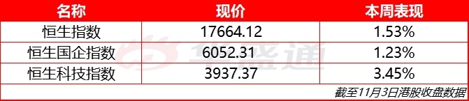 本周恒生指数涨幅1.53%,报17664.12点;恒生科技指数涨幅3.45%,报3937.37点;国企指数涨幅1.23%,报6052.31点。