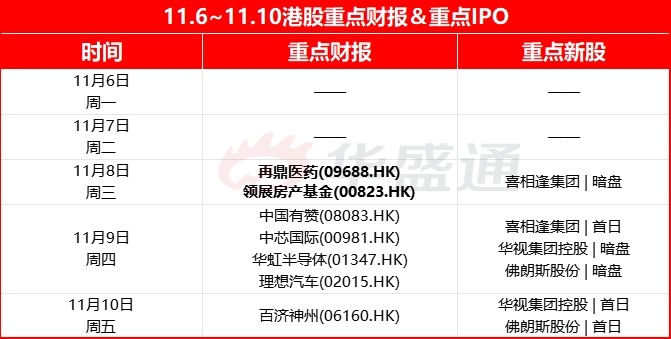 港股新股方面,喜相逢集团预计11月9日上市;华视集团控股、佛朗斯股份将于11月10日上市。