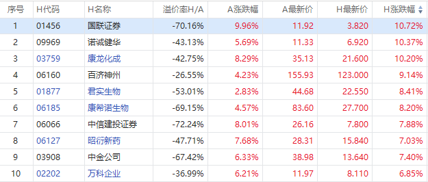 截至发稿,国联证券A股涨停,H股涨10.72%;诺诚健华A股涨5.69%,H股现涨10.37%;康龙化成A股涨8.29%,H股涨10.2%。