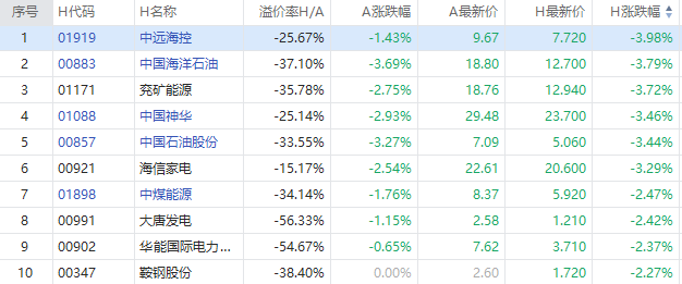中远海控A股跌1.43%,H股现跌3.98%;中国海洋石油A股跌3.69%,H股跌3.79%;兖矿能源A股跌2.75%,H股跌3.72%。