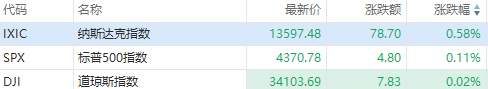 美股三大指数盘中皆小幅上涨,纳指涨0.58%,标普500指数涨0.11%,道指涨0.02%。