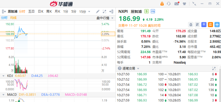 恩智浦 $NXPI 涨超2%,第三季度业绩超预期,智能手机需求有所复苏。