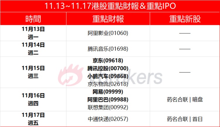 下周港股财报季迎来重磅个股集中放榜,投资者颇为熟悉的腾讯 $00700.HK 、阿里 $09988.HK 、京东 $09618.HK 、网易 $09999.HK 都将发布财报。除了财报里的数字外,这也是上市公司高管们谈论公司近况和发展前景的机会,例如“双十一”购物季的状况、阿里“1+6+N”组织变革后的IPO进展,以及腾讯、META有关VR设备的合作等,都是资本市场关注的热点。