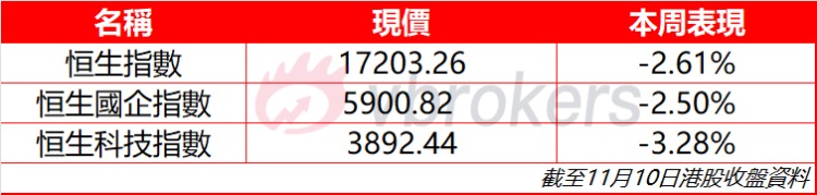 本周恒生指数跌2.61%,报17203.26点;恒生科技指数跌幅3.28%,报3892.44点;国企指数跌幅2.50,报5900.82点。