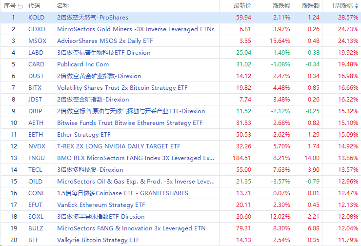 从美股ETF涨幅榜来看,能源和半导体相关ETF上榜较多,其中2倍做空天然气 $KOLD 周涨28.57%,2倍做空标普原油与天然气探勘与开采产业ETF $DRIP 周涨15.32%,3倍做多半导体指数ETF $SOXL 涨超12%。