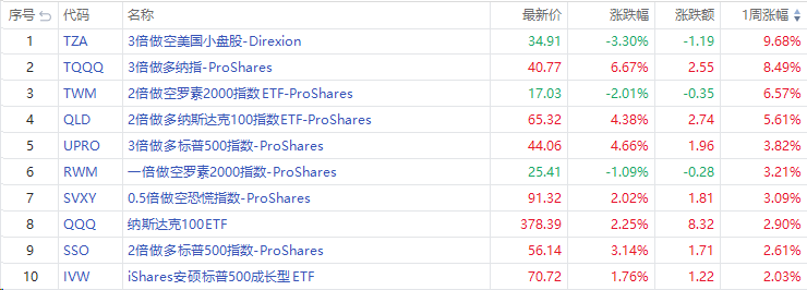 指数ETF方面,本周做空小盘股与做多纳指ETF领跑,3倍做空美国小盘股 $TZA 周涨9.68%;3倍做多纳指 $TQQQ 周涨8.49%;2倍做空罗素2000指数ETF $TWM 周涨6.57%。