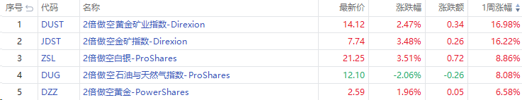 大宗商品ETF方面,2倍做空黄金矿业指数 $DUST 周涨近17%;2倍做空金矿指数 $JDST 周涨16%;2倍做空白银 $ZSL 周涨超8%。