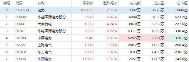 华盛资讯11月13日消息,港股电力板块早盘强势领涨,截至发稿,华能国际电力股份涨近6%,大唐发电涨超4%,华电国际电力股份、中国电力涨超2%,上海电气、东方电气、华润电力涨超1%。