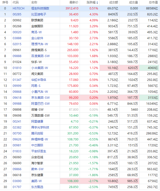 其他成分股方面,比亚迪电子、联想集团涨超4%,金蝶国际涨超3%,商汤-W涨超2%。