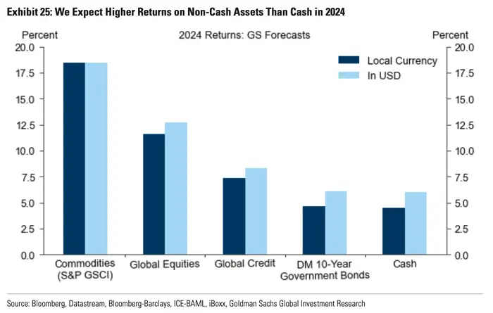 不过高盛预计,到2024年,信贷、股票和大宗商品的回报率将超过现金。