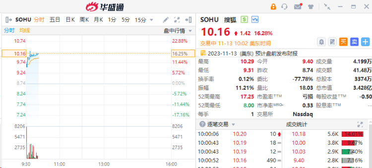 搜狐 $SOHU 涨超16%。搜狐第三季度总收入为1.45亿美元,非美国通用会计准则净亏损为1000万美元,较去年同期净亏损1700万美元收窄。公司宣布为期两年,总金额最高为8000万美元的股票回购计划。搜狐创始人、董事局主席兼首席执行官张朝阳表示:“第三季度我们持续优化产品,提高运营效率。基于此,本季度收入及净利润均符合此前预期。”