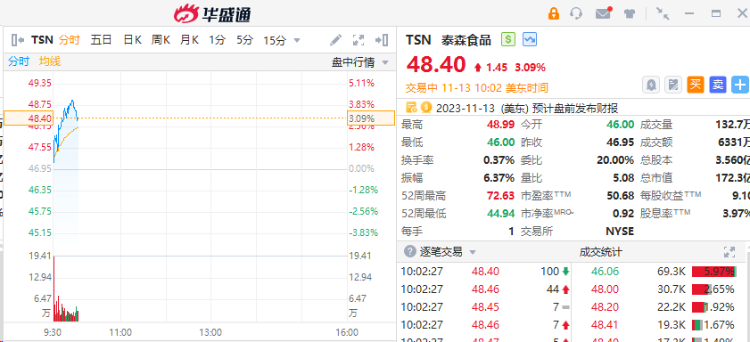 泰森食品 $TSN 涨超3%。泰森食品公布第四财季业绩,销售额为133.5亿美元,同比下降2.83%,低于市场预期的137.3亿美元;每股收益为0.37美元,同比下降77.3%,但高于市场预期的0.29美元。公司预计2024财年销售额与2023财年的528.8亿美元持平。