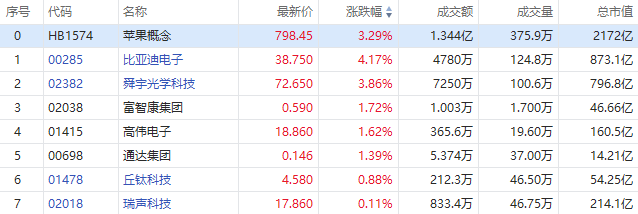 华盛资讯11月14日消息,港股苹果概念股早盘延续强势,截至发稿,比亚迪电子涨超4%,舜宇光学科技涨近4%,富智康集团、高伟电子涨超1%,丘钛科技、瑞声科技跟涨。