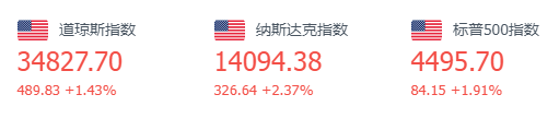 周二,美国三大股指全线收涨,道指涨1.43%报34827.7点,纳指涨2.37%报14094.38点,标普500指数涨1.91%报4495.7点。家得宝涨5.46%,领涨道指。大型科技股齐升,特斯拉涨6.12%,亚马逊涨2.25%。热门中概股普遍上涨,纳斯达克中国金龙指数涨2.18%,比特小鹿涨32.63%,虎牙直播涨7.46%,亿航智能涨5.84%;跌幅方面,世纪互联跌7.65%,搜狐跌3.06%。中概新能源汽车股全线上涨,蔚来汽车涨5.06%,小鹏汽车涨8.62%,理想汽车涨0.99%。美债收益率走低,2年期美债收益率跌20个基点报4.847%,3年期美债收益率跌21.6个基点报4.601%,