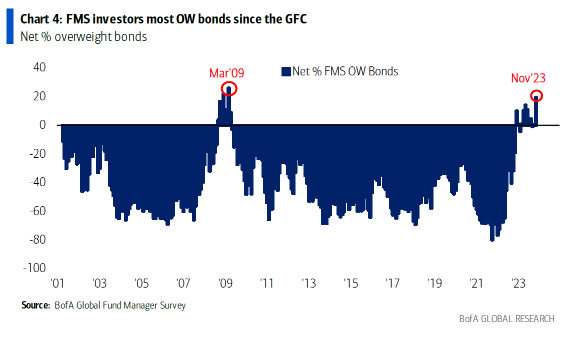 美国银行对基金经理的最新调查显示,由于“坚信”利率将在2024年下调,投资者对债券的看好程度达到了金融危机以来的最高水平。