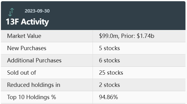 据统计,Scion第三季度持仓总市值为9900万美元,上一季度总市值为1.74亿美元,环比下降43%。该公司第三季度持有的个股减至仅13个。该公司在第三季度的投资组合中新增了5只个股,增持了6只个股,减持了2只个股,清仓了25只个股。其中前十大持仓标的占总市值的94.86%。