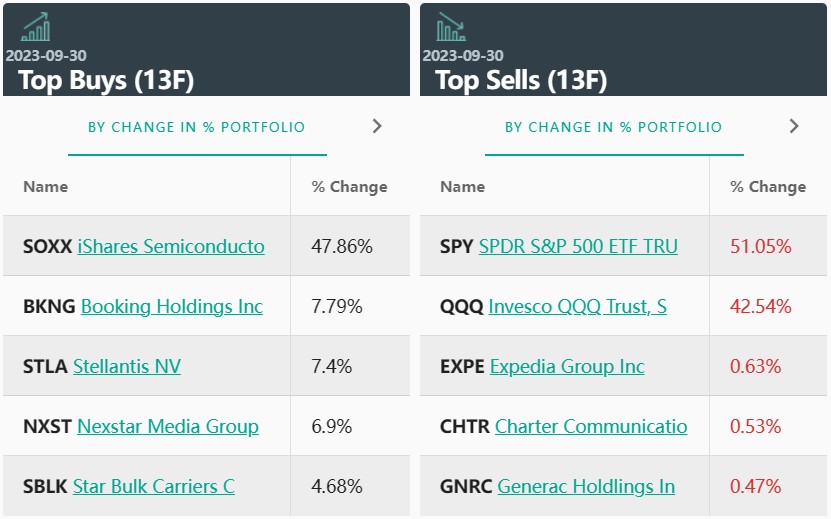 从持仓比例变化来看,前五大重仓股即为前五大买入标的。前五大卖出标的包括:SPDR标普500指数ETF看跌期权、Invesco纳斯达克100指数ETF看跌期权、在线旅游公司Expedia(EXPE.US)、特许通讯(CHTR.US)、Generac(GNRC.US)。