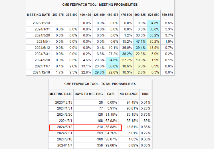 根据CME的FedWatch工具,市场预计到2024年6月,利率将低于当前水平(即降息)的可能性为85%。