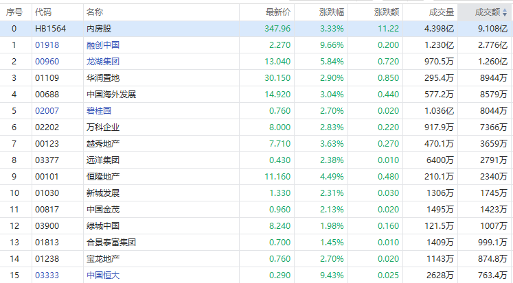 11月15日讯,港股内房股大幅走高,截至发稿,中国恒大、融创中国大涨超9%,龙湖集团涨超5%,碧桂园、华润置地涨近3%。