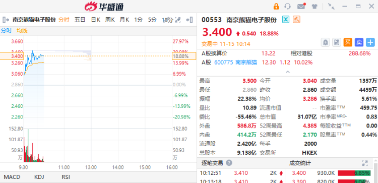 11月15日,南京熊猫电子股份早盘再度走强,截至发稿,涨18.88%,报3.4港元,成交额4459万港元。值得关注的是,该股近三日累涨近48%。