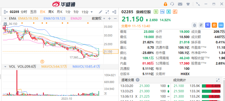 11月15日讯,港股泉峰控股(02285)触底反弹14%,截至发稿,报21.15港元,成交额4407万港元。