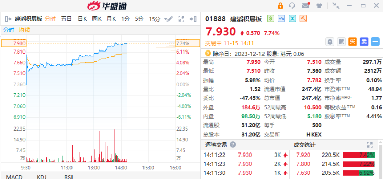 11月15日,建滔系近期表现强势,午后集体走高。截至发稿,建滔积层板涨7.74%,报7.93港元;建滔集团(00148)涨4.03%,报19.6港元。