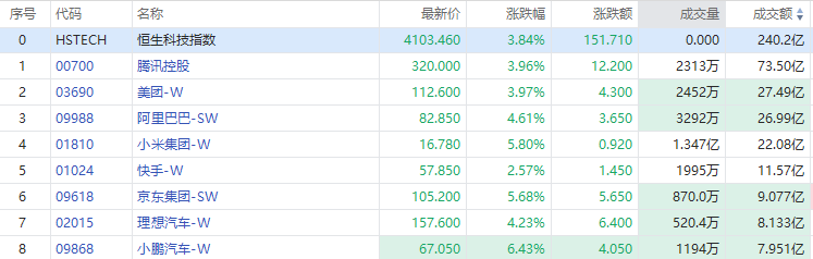 华盛资讯11月15日讯,恒生指数、恒生科技指数尾盘直线拉升,现双双涨超4%,汽车及科网股造好,小鹏汽车(09868.HK)、蔚来汽车(09866.HK)均涨超6%,小米集团(01810.HK)、京东(09618.HK)、均涨超5%,阿里巴巴(09988.HK)、百度(09888.HK)均涨超4%。