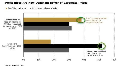 但自2020年以来,情况发生了逆转:劳动力只占企业价格变化的30%,而利润所占的份额却上升到了38%。利润现在是企业价格的最大单一驱动因素,因此对通胀的影响要大得多。