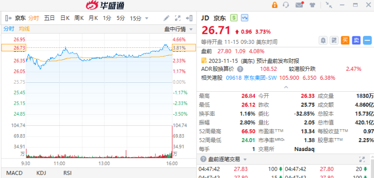 京东 $JD 美股盘前涨超4%,报27.8美元。京东第三季度收入为2477亿元,同比增加1.7%;归属于本公司普通股股东的净利润为79亿元,同比增长31.7%,高于市场预期的69.7亿美元。期内服务收入达到524亿元,占整体收入的比例首次超过20%,达到21.2%;作为核心品类的电子产品及家用电器继续保持收入同比增速高于行业平均水平。