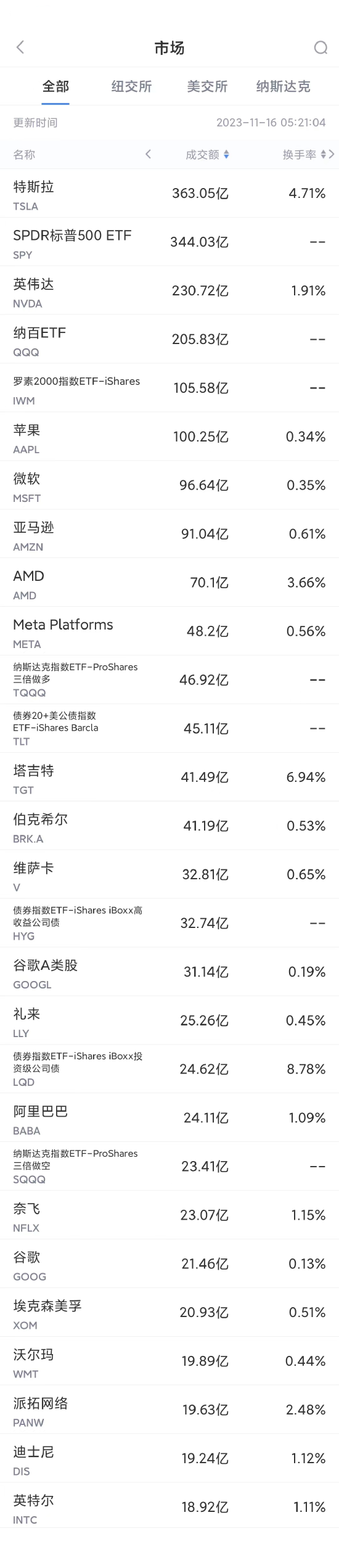 以下为美股当日交易最活跃的20只股票(按成交额):