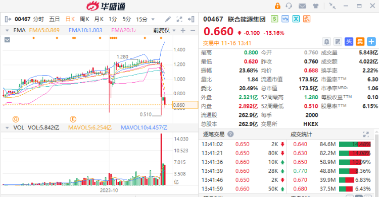 11月16日讯,港股联合能源集团(00467)今日一度再跌17%,周内股价一度腰斩。截至发稿,跌13.16%,报0.66港元,成交额4.02亿港元。
