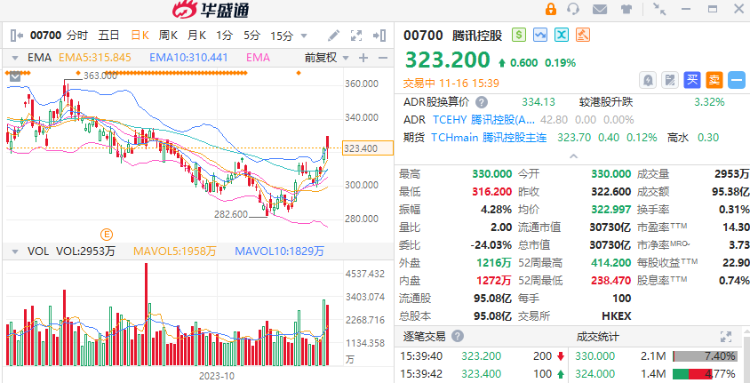 腾讯今早开市高见330港元,突破2个月高位,及后倒跌。现报320.8港元,跌约0.6%。