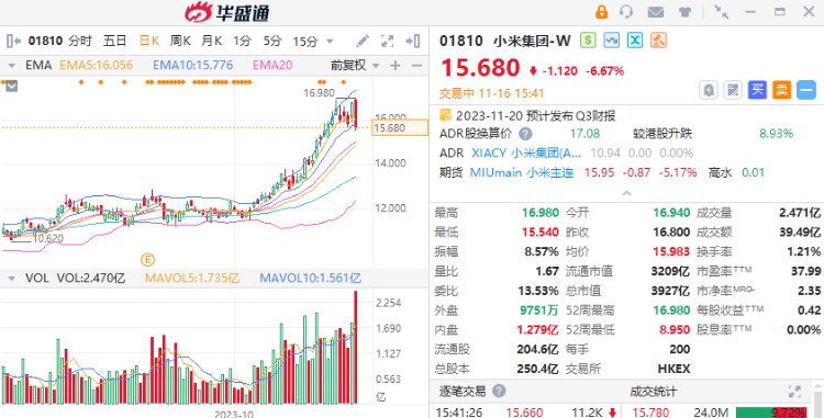 内地工信部公告显示小米首款电动汽车获初步批准,料于明年上半年推出,不过消息未能支撑股价,小米今再受制17港元后下跌,更再穿16港元大关,日线图上出现穿头破脚的阴阳烛,属利淡形态,而港股通昨日第四日卖出小米。