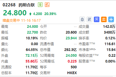 华盛资讯11月16日讯,药明合联正在暗盘交易,截至发稿,现涨20.39%,中签一手账面浮盈约2100港元,最新总市值285亿港元,该股将于明日正式挂牌港交所上市。