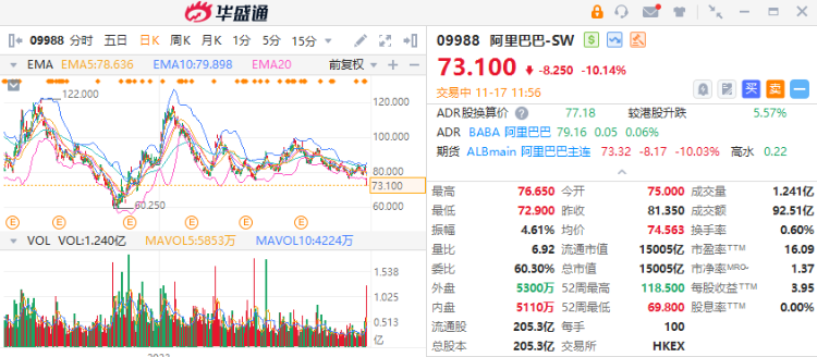 华盛资讯11月17日讯,阿里巴巴-SW绩后低开低走,早盘狂泻10%,股价创近一年低位。阿里系也全线下挫,阿里健康跌超5%,高鑫零售、阿里影业跌近2%。
