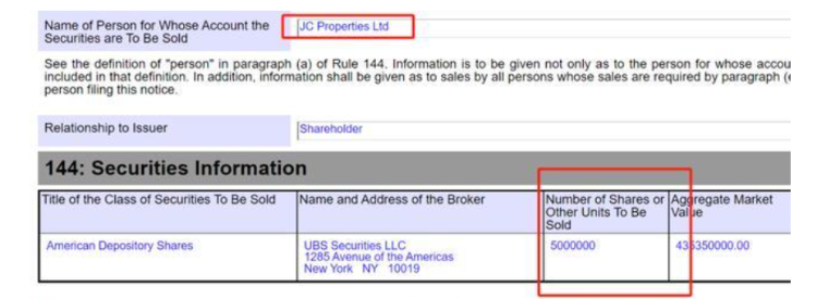 根据美国证券交易委员会网站两份11月15日提交的144文件,两家归属于马云家族信托的实体——JC Properties Ltd和JSP Investment Ltd,预期将在11月21日左右出售共1000万股阿里巴巴股票。这笔1000万股股票出售价值约8.7亿美元。