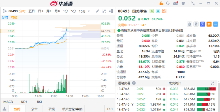 华盛资讯11月17日讯,港股国美零售午后持续拉升,涨幅现扩大至67%,当前成交额2.59亿港元。国美超市正式上线,计划三年开10000家。
