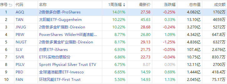 大宗商品ETF方面,2倍做多白银ETF $AGQ 周内大涨14%,2倍金矿指数ETF $JNUG 周涨10%;太阳能ETF $TAN 涨超10%。