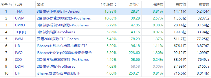 涨幅榜方面,3倍做多小型股ETF $TNA 大涨16%,2倍做多罗素2000ETF $UWM 周涨10%,标普小盘股ETF $IJR 周涨5.20%。