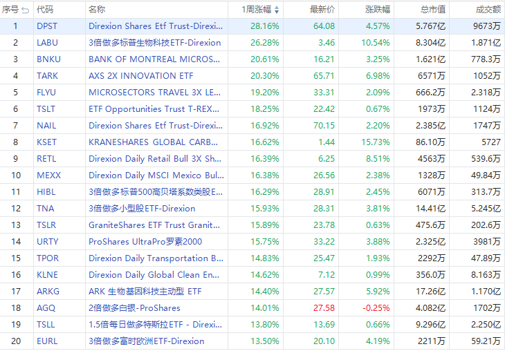 从美股ETF涨幅榜来看,银行和生物行业相关ETF上榜较多,其中3倍做多区域银行股ETF $DPST 周内暴涨28%,3倍做多美国银行业ETF $BNKU 周涨20%;3倍做多生物科技ETF $LABU 周涨26%.