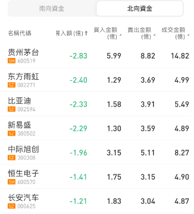 北向资金今日净卖出28.59亿元。浪潮信息、江淮汽车分别获净买入1.41亿元、1.31亿元。贵州茅台净卖出额居首,金额为2.83亿元。
