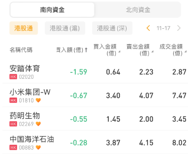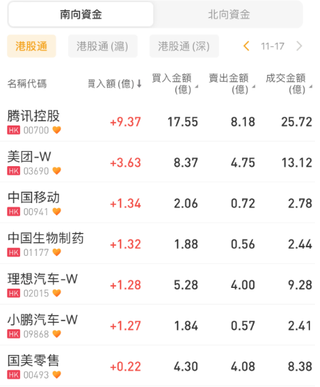 南下资金今日买入腾讯控股9.37亿港元,美团-W、中国移动获净买入3.63亿港元、1.34亿港元;安踏体育、小米集团-W遭抛售1.59亿港元、0.67亿港元。