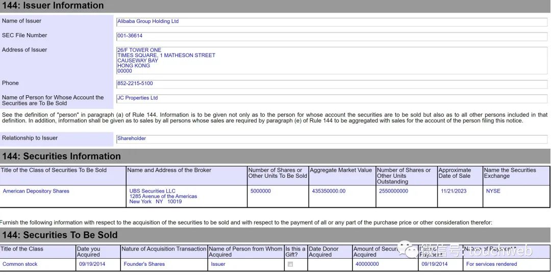 阿里巴巴递交给美国SEC的文件显示,马云家族信托JC Properties Limited(英属维尔京群岛公司)和JSP Investment Limited(英属维尔京群岛公司)拟于11月21日分别减持500万股股阿里巴巴创始人股份。
