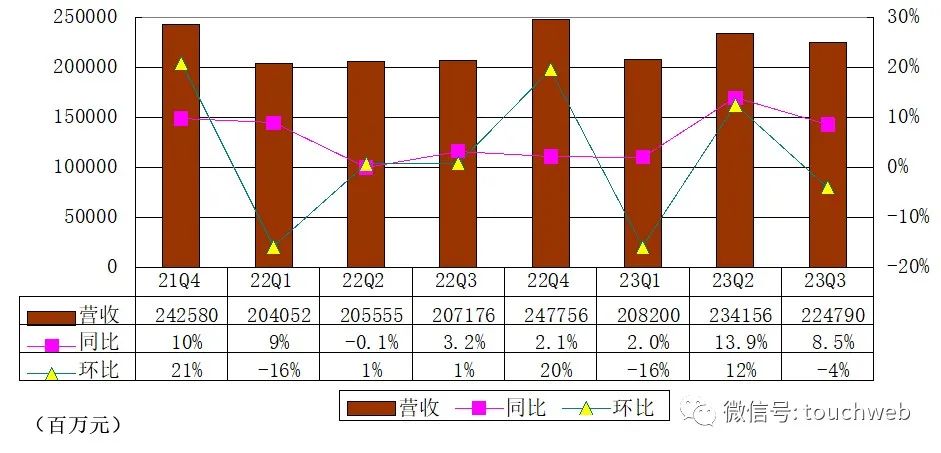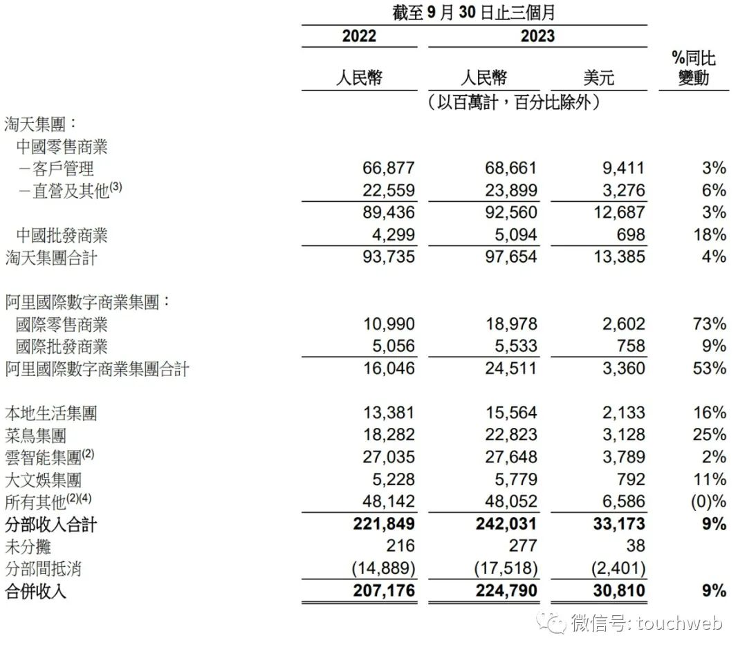 财报显示,阿里巴巴2023年第三季度营收为2247.90亿元(308.10亿美元),同比增长9%。在当前的环境下,阿里的财报还算靓丽。