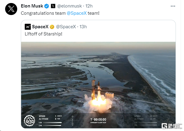 随后,马斯克也向团队表达祝贺。