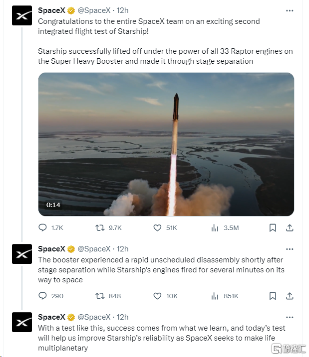 SpaceX 质量工程经理Kate Tice表示,尽管确实第二级助推器和星舰都发生了“快速,意料之外的解体”,但是今天的试飞仍然是很成功的。SpaceX也在X平台发文称: