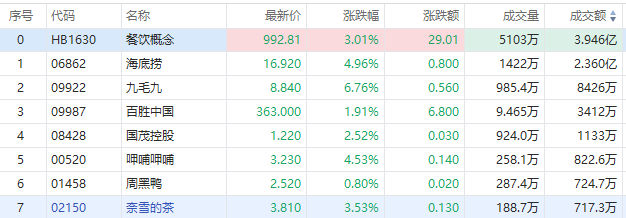 11月20日讯,餐饮股今日回暖,截至发稿,九毛九(09922)涨6.64%,报8.83港元;海底捞(06862)涨5.71%,报17.04港元;呷哺呷哺(00520)涨4.21%,报3.22港元;奈雪的茶(02150)涨4.08%,报3.83港元;百胜中国(09987)涨1.63%,报362港元。