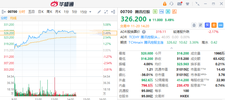 腾讯(00700)午后上涨3.55%,现报326.40港元,成交额61.94亿港元。