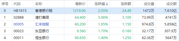 11月20日讯,港股银行股今日集体拉升,截至发稿,渣打集团大涨逾5%,汇丰控股、东亚银行涨近2%。