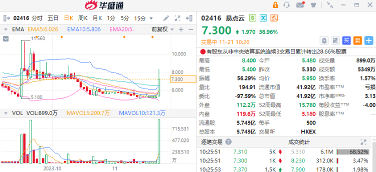 11月21日讯,港股易点云(02416)盘中一度飙升逾55%,截至发稿,涨36.96%,报7.30港元,成交额5349万港元。